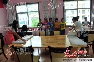 2014年6月8日,湖北省秭归县职业教育中心学生在实训基地进行西餐摆台训练。